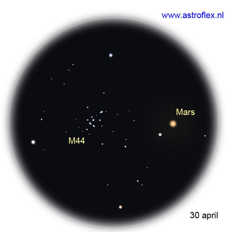 Zie je dit bericht te laat, of is het vanavond bewolkt? Dan kun je de komende avonden in de herkansing, want Mars beweegt komende dagen zelfs nog verder in dezelfde kijkrichting van M44. In de nacht van 3 op 4 mei komt de maan er ook vlakbij staan. Na 5 mei beweegt Mars steeds iets verder van de sterrenhoop af, maar nog steeds kun je het stel een aantal avonden in één verrekijkerbeeld vangen.
